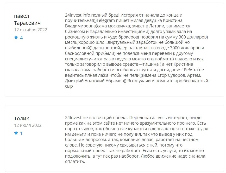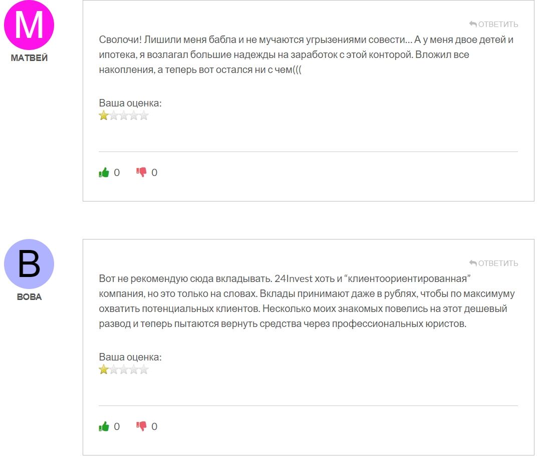 Пользователи сайта trader-otzyv.ru однозначны в своих оценках. На этом мониторинге представлены только негативные отзывы о 24Инвест. Абсолютно все клиенты слили сбережения по вине мошенников. Истории обманутых пользователей показывают опасность сотрудничества с шарагой.