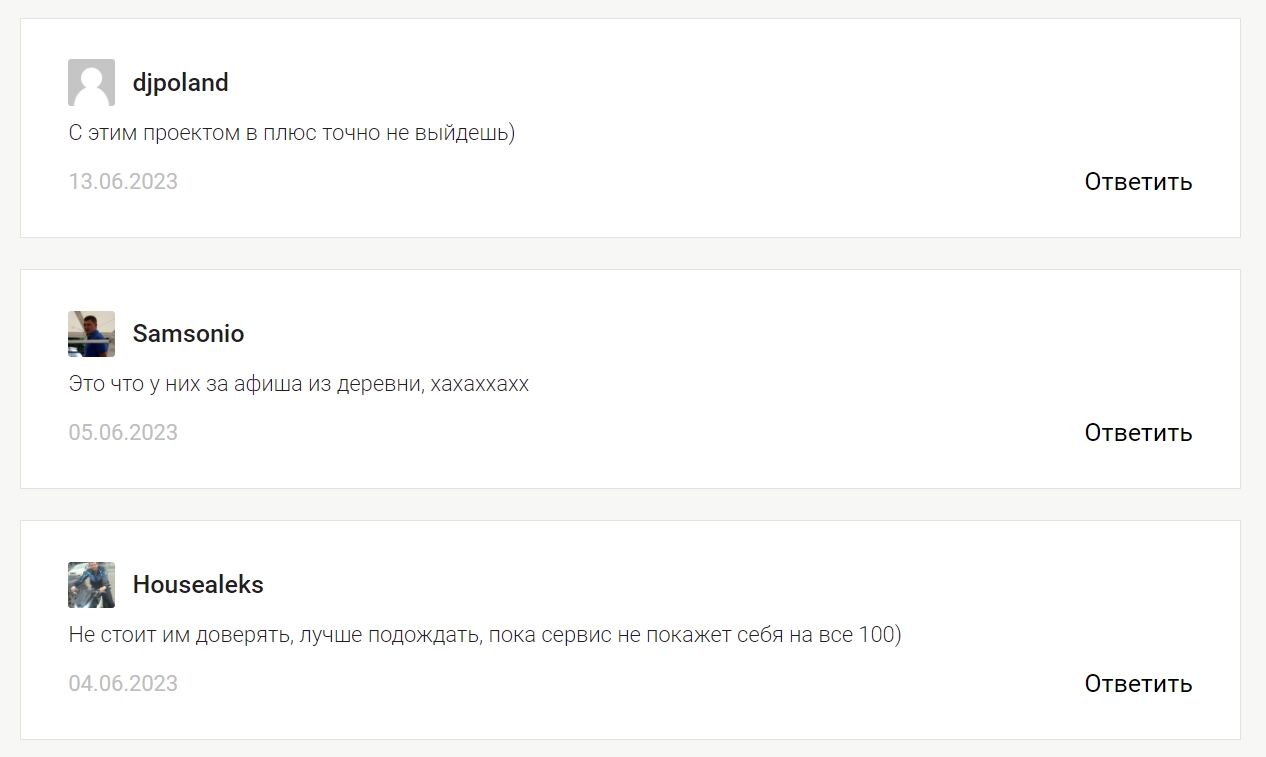Некоторые советуют подождать и увидеть, сможет ли сервис доказать свою надежность, в то время как другие категорически отговаривают от любых инвестиций в этот проект, считая его ненадежным. Общее мнение среди комментаторов сводится к тому, что вложения в площадку не принесут ничего, кроме разочарования и убытков.