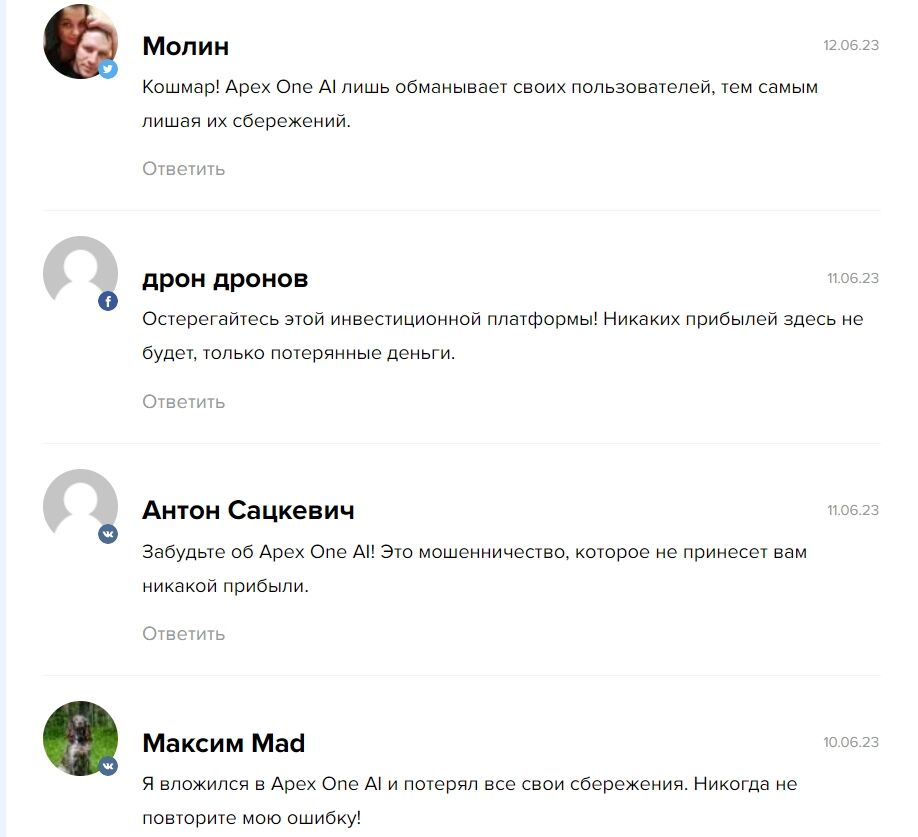 У действующих клиентов и экс-инвесторов есть масса вопросов к администрации APEX ONE IO отзывы наглядно иллюстрируют недовольство людей. В Рунете нет ни одного положительного комментария, подтверждающего целесообразность сотрудничества с проектом. На профильных форумах и мониторингах встречаются исключительно жалобы.