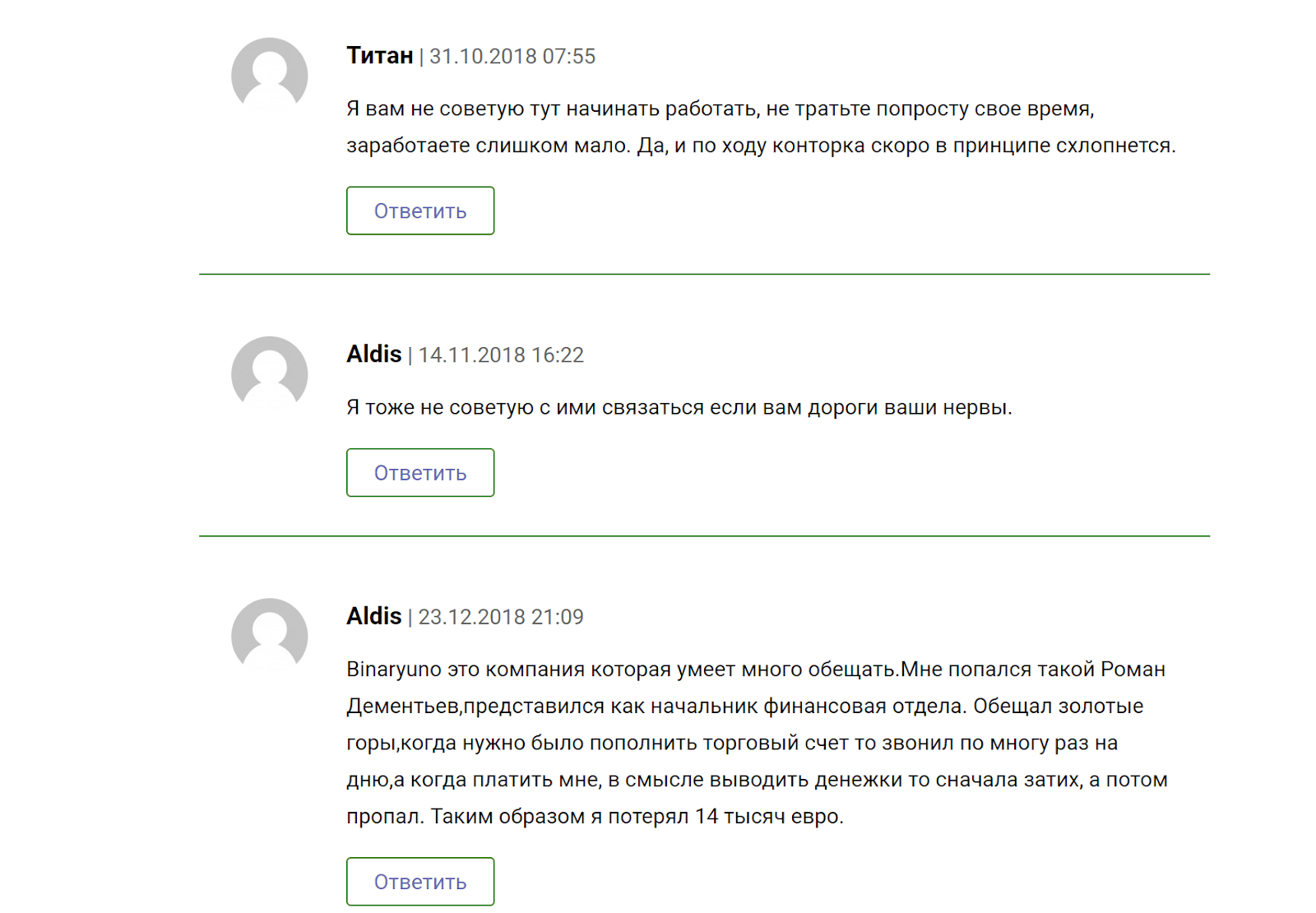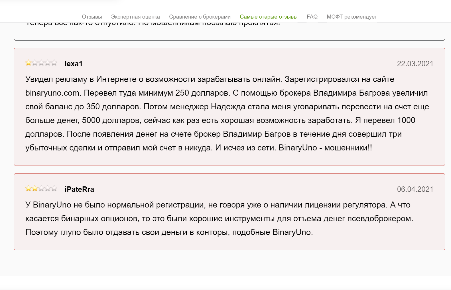 Если посмотреть на дату публикации отзывов, действительно организация работает в этом сегменте длительное время. Число обманутых трейдеров растет ежемесячно. Но, присутствует подозрение, что Binary Uno платят за удаление негативных отзывов. Поскольку в старых обзорах на независимых мониторингах можно отыскать скриншоты комментариев с других источников. И при переходе на те источники, отзывов не оказывается, но обзор весит.