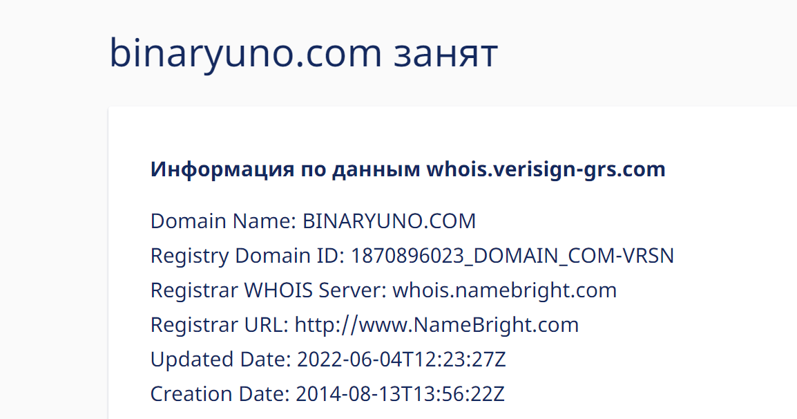 | Домен официального сайта | https://www.binaryuno.com/ |