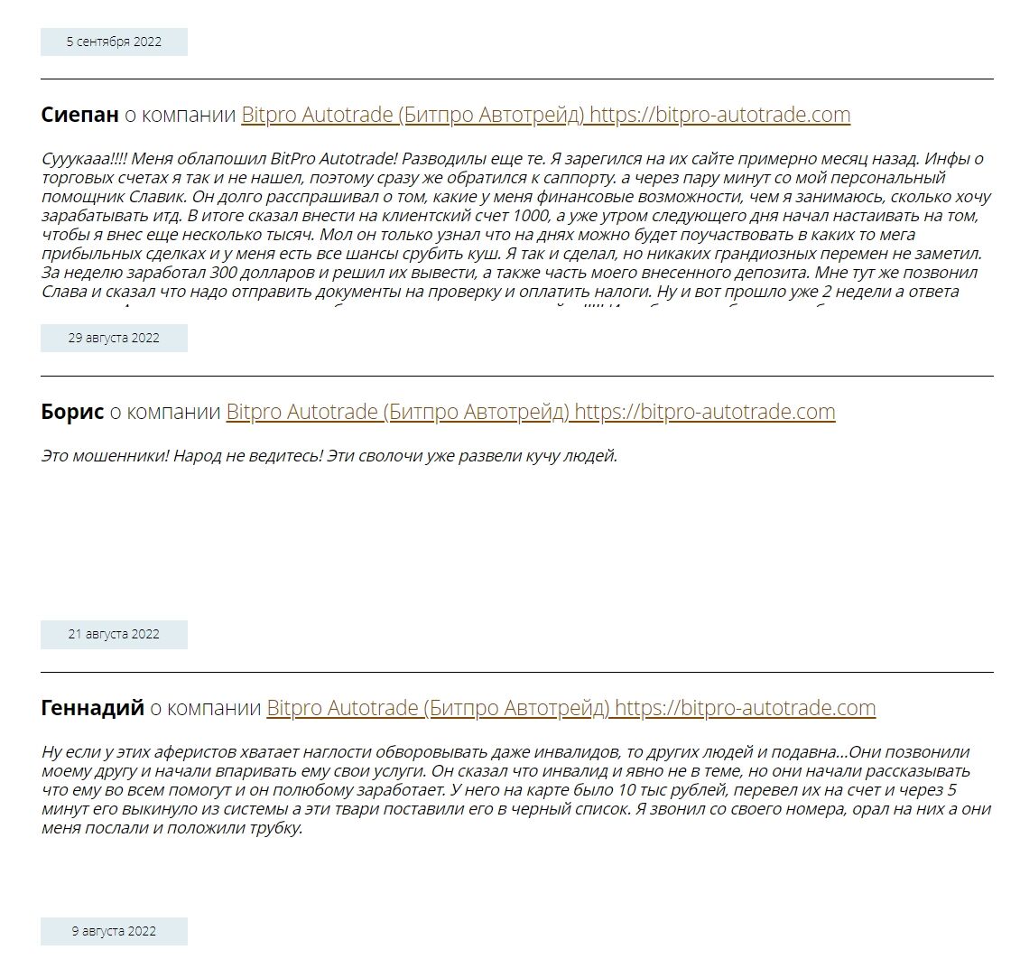 Невзирая на минимальный опыт работы проекта, отзывы о bitpro-autotrade.com появляются на многих авторитетных мониторингах с завидной регулярностью. Преимущественно это жалобы обманутых клиентов. Ни одного положительного комментария найти не удалось.