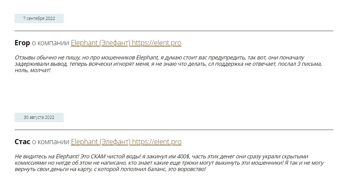 Несмотря на обещания и гарантии администрации финансовой пирамиды, пользователи называют проект мошеннической площадкой. В Рунете встречаются исключительно негативные отзывы о elent.pro, авторы которых сообщают о тотальном сливе инвестиционного капитала.