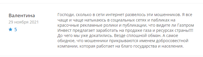 Валентина также выразила свое разочарование по поводу увеличивающегося числа мошенников в интернете. Она увидела множество рекламных роликов и публикаций, в которых утверждалось, что Газпром Инвест предлагает заработать на продаже газа и ресурсах страны. Валентина отметила, что это печальное явление, и что мошенники используют имя добросовестной компании, которая служит благу государства и населения.