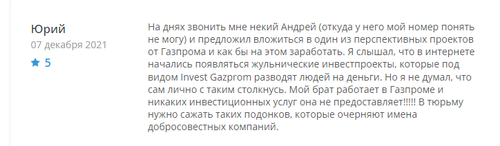 - Один из наиболее серьезных негативных моментов заключается в использовании имени “Газпром” для обмана инвесторов. Газпром Инвест не имеет официальных связей с холдингом и прикрывается его престижным именем, чтобы завлечь доверчивых инвесторов.