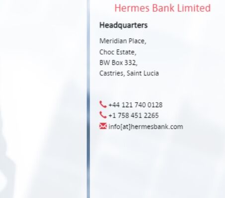 Hermes Bank – это классический оффшорный банк, прошедший регистрацию в Сент-Люсии, а подчиняется только юрисдикции Великобритании. Компания не получила лицензии, не стала размещать реквизиты и имена тех, кто занимается обслуживанием клиентов. Банк hermesbank.com не включен в рейтинг лучших организаций в этом сегменте. Нет хвалебных комментариев в сети, что подтверждает как низкую узнаваемость банка, так и неконкурентные условия сотрудничества.
