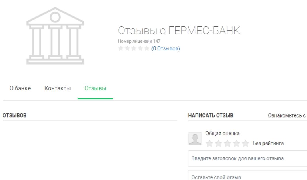 Начнем с того, что кроме комментариев клиентов есть еще рейтинг банков. Чем выше разместилась банковская организация, тем надежней сервис. Отметим, что Hermes Bank встречается крайне редко в списках независимых мониторингов и ТОПах. Это указывает на низкую узнаваемость банка. Собственно, количество отзывов о Hermes Bank выступает доказательством этого.
