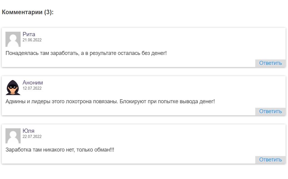 Обманутые клиенты подтверждают, что истории успеха людей, сумевших заработать деньги на работе с этим проектом – вранье. Они работают совместно с администрацией. Никто не зарабатывает на сотрудничестве с рассматриваемой компанией. Попытки вывести деньги блокируются.