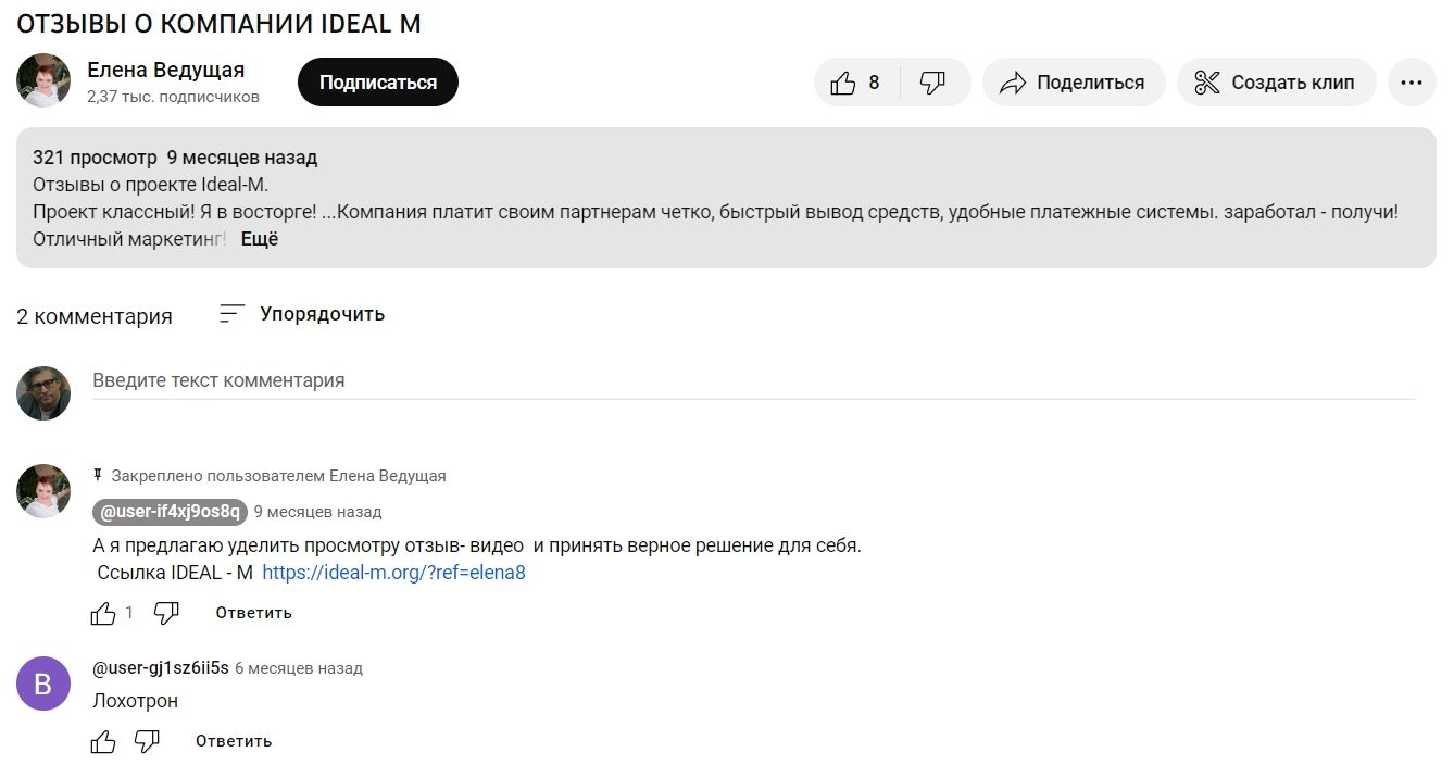 О проекте крайне редко встречается информация на независимых сайтах об инвестициях, форумах и финансовых мониторингах. Удалось отыскать буквально несколько обзоров ideal-m.org и с десяток отзывов. Столь низкий уровень популярности МЛМ-компании свидетельствует о том, что мошенникам не хватило денег на пиар.