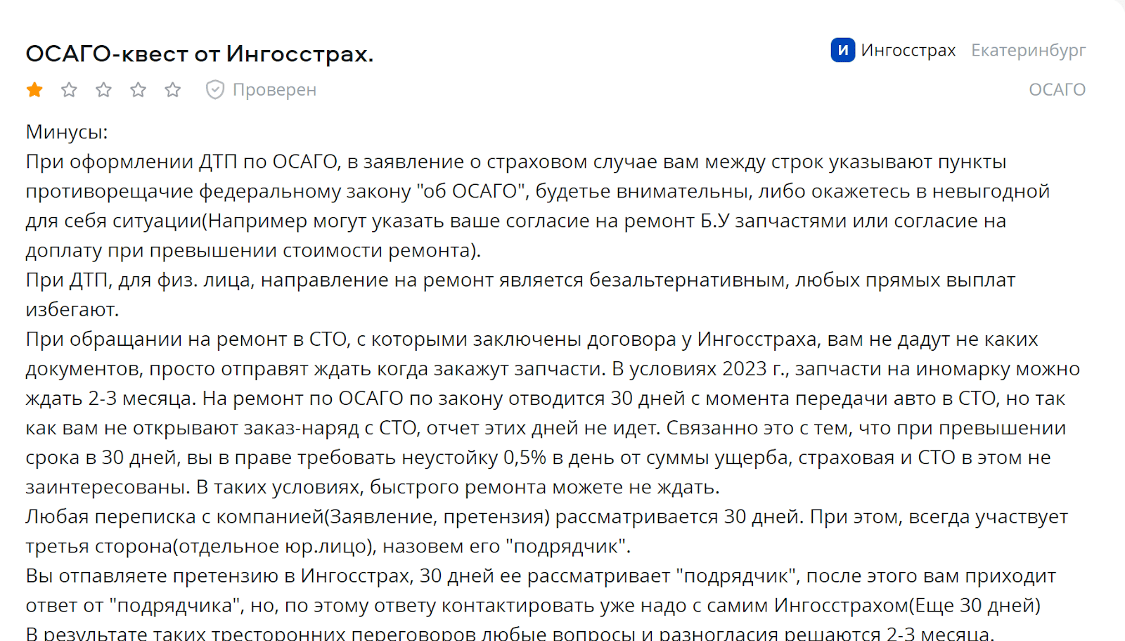 Еще одна история о том, как пользователь добивался выплаты по страховке около полугода. При этом компания водила его за нос. Денис не рекомендует оформлять ОСАГО через Ингосстрах.