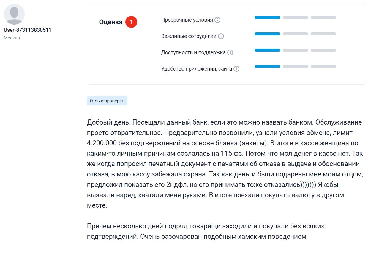Один из отзывов детализирует опыт обмена валюты в банке, описывая серию неприятных инцидентов, начиная от предварительного общения с сотрудниками фирмы и заканчивая конфликтной ситуацией в кассе, которая привела к вызову охраны. Этот отзыв подчеркивает не только проблемы в общении с персоналом и сомнения в их профессионализме, но и серьезные вопросы к управлению и корпоративной культуре. Отсутствие четкой и последовательной политики, а также непрофессиональное поведение сотрудников, серьезно подрывают доверие клиентов и их желание продолжать пользоваться услугами конторы.