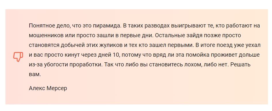- агрессивная реферальная программа: шарага активно использует партнерскую систему, что является характерной чертой многих финансовых пирамид. Они зависят от привлечения новых инвесторов для поддержания выплат текущим участникам;