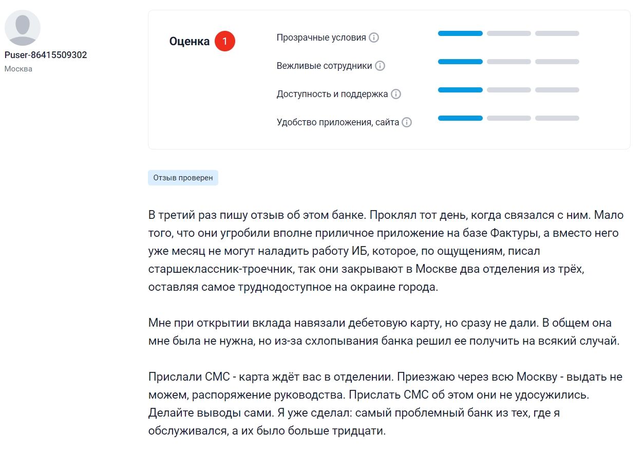 В первую очередь, отмечается низкое качество обслуживания и технической поддержки. Один из клиентов выразил свое недовольство по поводу неудачного обновления банковского приложения и закрытия двух из трех отделений в Москве, что существенно усложнило доступ к услугам банка. Также он указал на проблемы с получением дебетовой карты, которую ему навязали при открытии вклада, но так и не выдали, ссылаясь на распоряжение руководства, при этом не уведомив заранее об изменении условий.