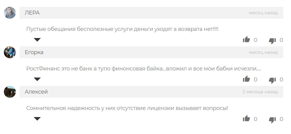Аргументы в пользу сотрудничества с компанией разбиваются об шквал критики в адрес РостФинанс отзывы пользователей показывают систематическое нарушение прав инвесторов со стороны банка. Безусловно, это настораживает потенциальных клиентов.