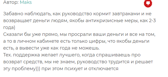 Инвестор выражает свое недовольство несостоявшимся возвратом средств со стороны SafeAssets. Он саркастично отмечает, что руководство предпочитает «кормить завтраками» и не возвращать деньги под предлогом антикризисных мер. Клиент также упоминает о технической поддержке, которая, по его словам, психует и отключается при вопросах о возврате средств.