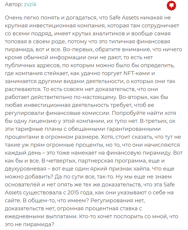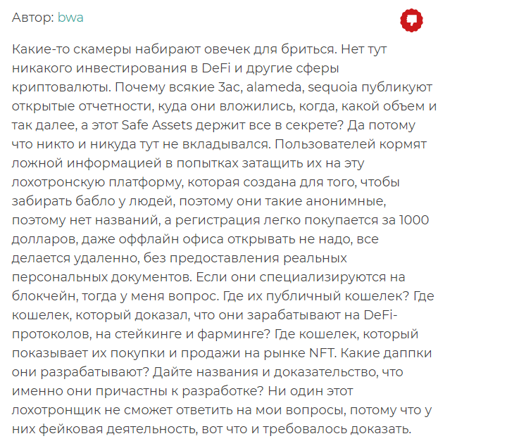 Пользователь настаивает, что SafeAssets не занимается реальными инвестициями и обвиняет компанию в предоставлении ложной информации. Он подчеркивает отсутствие открытых отчетов, публичных адресов, и анонимность создает подозрения относительно подлинности деятельности.
