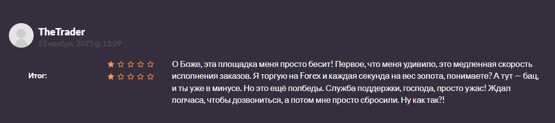 Автор жалуется на медленное исполнение сделок, что ведет к потерям при торговле на валютном рынке. Опять, упоминается долгое ожидание и неудовлетворительный ответ или даже игнор со стороны службы поддержки.