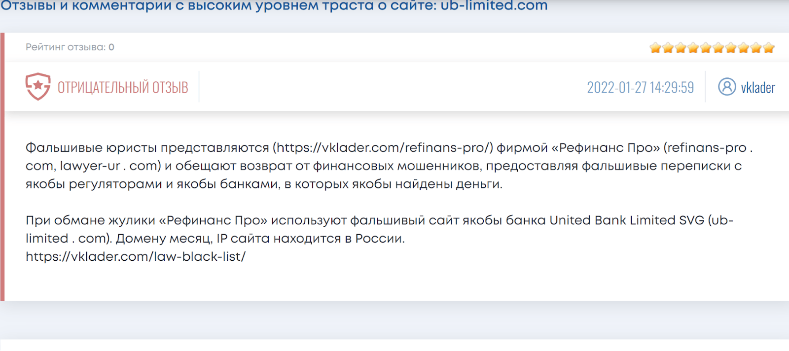 В процессе составления данного раздела мы столкнулись с тем, что откликов в сети достаточно мало. В результате чего сложно проанализировать сервис для оценки реализации заявленных обещаний. При анализе компании сложилось неоднозначное мнение касательно сегмента оказания услуг. Фирма якобы заявляет, что она банк, вместе с тем клиенты описывают ее как брокера и даже криптосредника. Можно встретить информацию о том, что Юнайтед Банк Лимитед СВЖ запущен липовыми юристами. Якобы в процессе контакта представители организации представляются сотрудниками «Рефинанс Про» и обещают вернуть деньги, ранее украденные аферистами.
